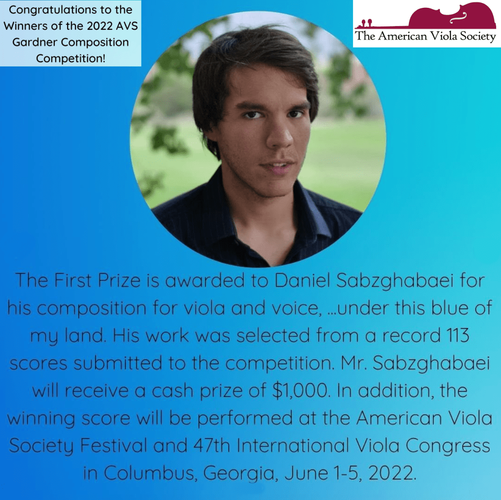 Daniel Reza Sabzghabaei’s viola and medium voice work …under this blue of my land was selected from a pool of 113 submissions as First Prize Winner of the American Viola Society’s 2022 Gardner Competition. His work will be featured at the 47th International Viola Congress in Columbus, Georgia, June 1-5, 2022.
